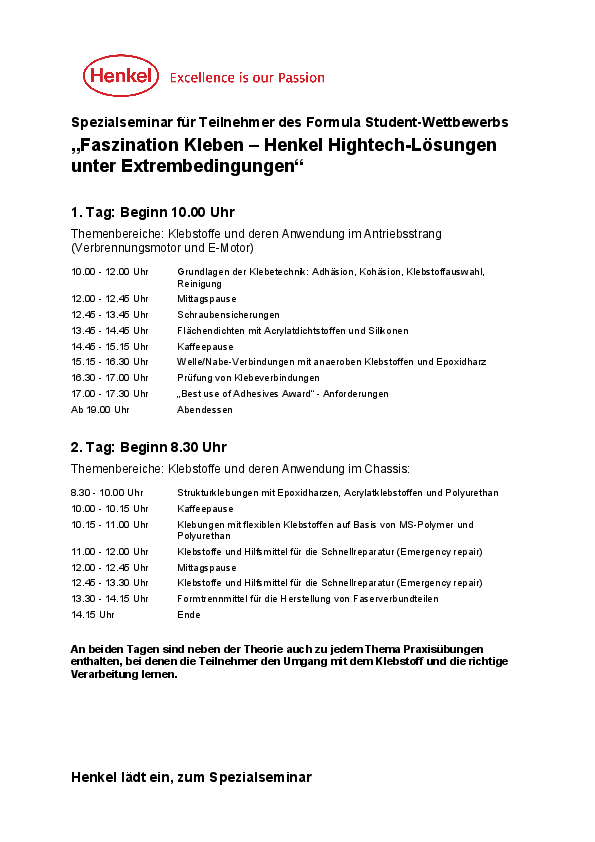Speziell für Studenten der Ingenieursstudiengänge, die sich an Formula-Student-Wettbewerben beteiligen, hat Klebstoffweltmarktführer Henkel in Kooperation mit Formula-Student-Organisationsleiter Dr. Ludwig Vollrath ein Kompaktseminar entwickelt, das zentrale Lösungen aber auch viele Detailkenntnisse des Klebens im Bereich des Antriebsstranges und des Chassis anschaulich und praxisnah vermittelt.