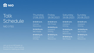 Our partner NIO will host several talks from Thursday to Sunday about NIO Power, Assisted Driving and the possibilities to Join the NIO Team.