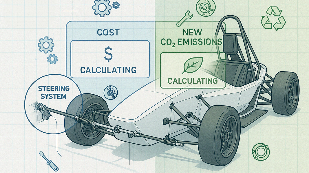 As in previous years, teams can add parts for both the BOM System and the CCBOM System. A new column has been introduced to display calculated emission values in CO₂ equivalents. The tool automatically sums up both cost and emissions values for the entire system, which, for the 2025 competition, is the Steering System.