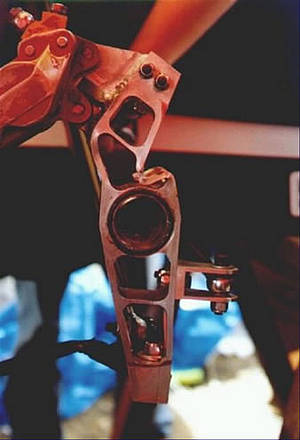 It can be seen where the brake torque has overcome the integrity of this CNC’d upright. A simple diagonal web instead of the horizontal webs seen here might have avoided this failure. But look at the other picture before accepting that advice.