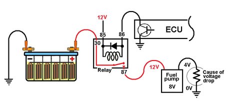 So, a series circuit with two equal loads would cause the voltage to drop to 6 volts between the loads which share the voltage pressure. The second ‘load’ in a circuit can be a resistance in the ground circuit, and this was the case with the car I was to drive. The guys repeatedly measured voltage at the fuel pump where there was a full 12 Volts. When the voltage was measured ACROSS the fuel pump the multimeter showed 8 Volts! No wonder the engine would not perform at higher RPM, the fuel pump could not deliver full flow and pressure.