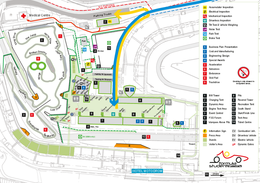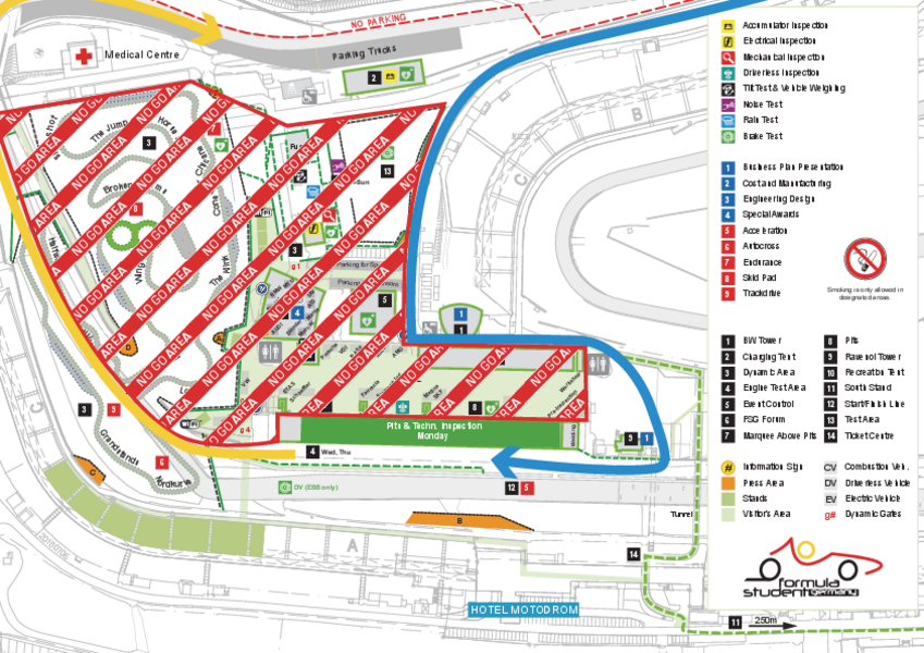Entering the Hockenheimring with your team truck and your team is split in three timeslots. All DV teams and the first two EV teams can enter on Monday from 10:00 to 12:00. The remaining 38 EV team can enter from 15:00 to 20:00. During the whole Monday all teams can only be on site with no more than 7 team members. These team member can be interchanged throughout the day. Please see the map attached below how to drive your team truck to the pits and how to move on the competition site which is still being build up during Monday.