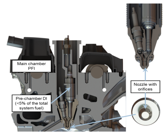 In both configurations the main chamber is fuelled through a conventional port or direct-injection injector. In the 'Passive' configuration,this is the sole source of fuelling making this arrangement suitable for use in λ=1 applications, with dilution being provided through the addition of exhaust gas recirculation (EGR). This system is compatible with conventional gasoline aftertreatment systems. In the 'Active' configuration a 2nd low-flow direct injector is incorporated into the pre-chamber assembly. This allows fuelling to be accurately, and independently, controlled in both the pre-chamberand the main chamber, enabling homogeneous ultra-lean combustionin modern gasoline engines, where mixtures leaner than λ=2can be ignited while retaining stability.